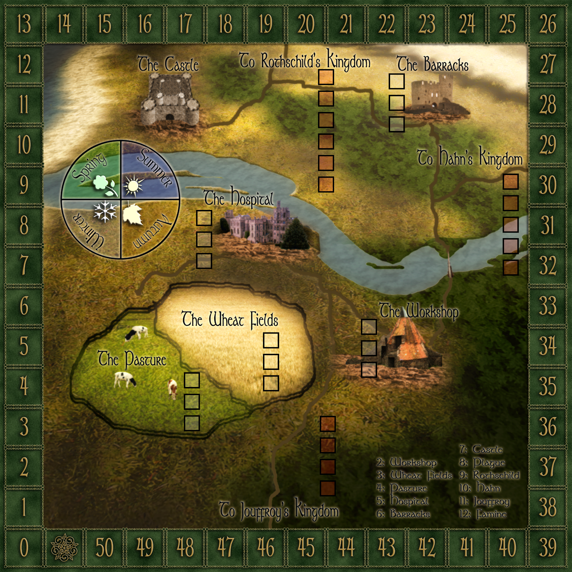 - Plagues: my current thought on how this works is as follows: When a plague occurs people may die. The base number is 1/2 the population (rounding down). But you get to subtract 1 for every worker in the hospital (including stacking). I feel like there needs to be more here though... there's not much for a player to do about this. The disaster just occurs without warning and you deal with it. Here's a raw idea that I just this instant came up with. What if you placed sick workers on the calendar (that the circular thing with the seasons on it) that represented how long they were sick for and you had by that time to use your doctors on them until they died.... I like this idea. I'll have to think about it more. I was going to use the calendar for another purpose that will likely have to change... I like this idea better.